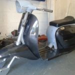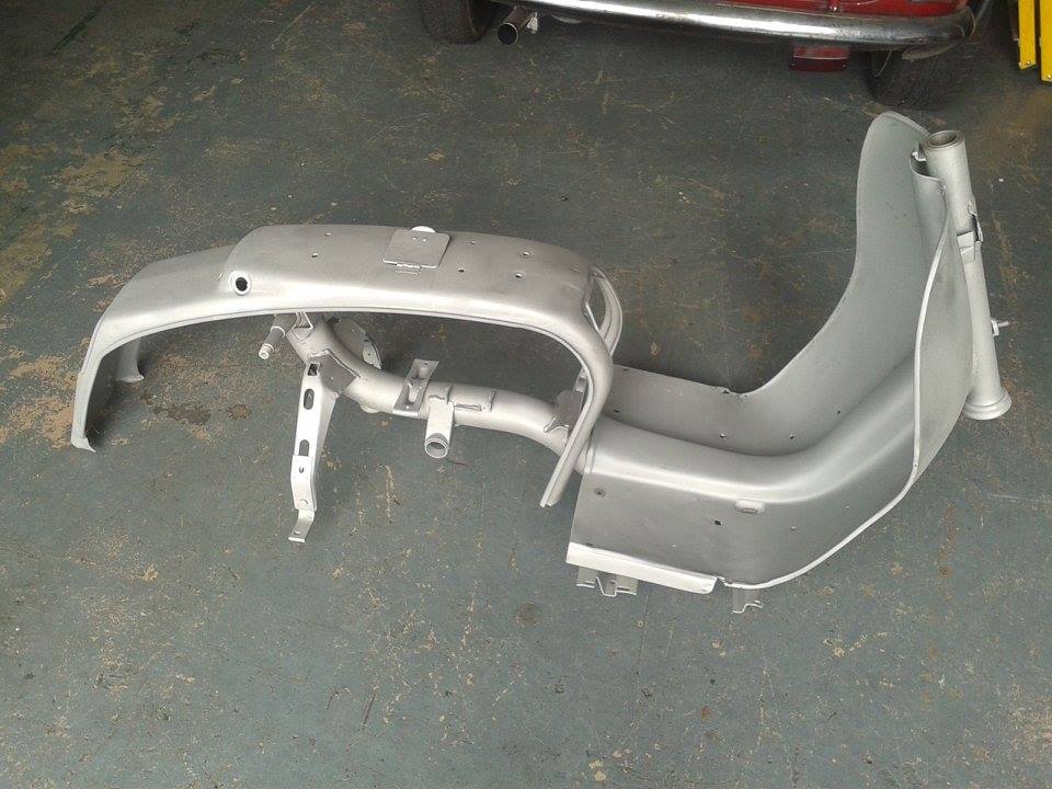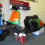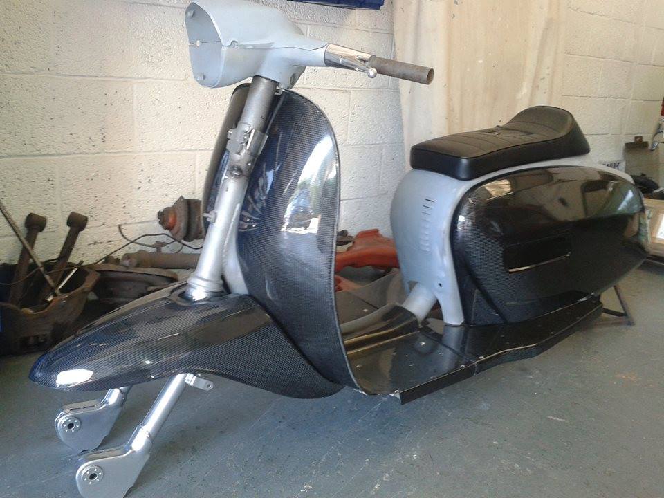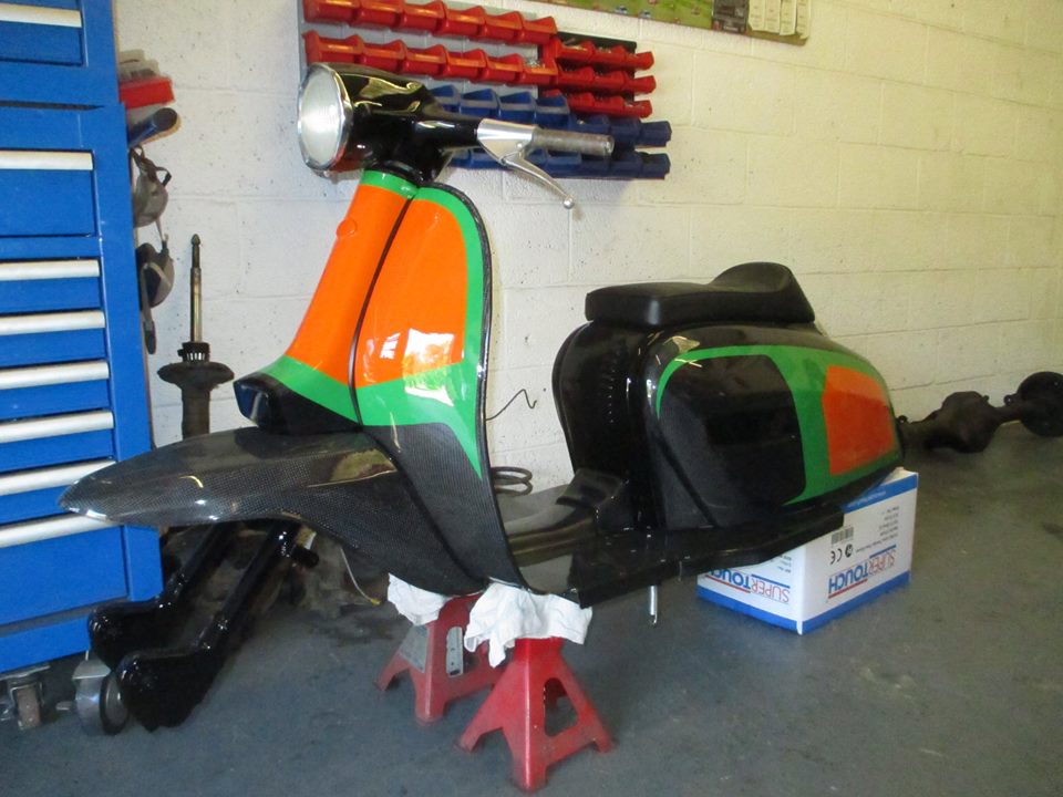 The scooter was stripped and sand blasted before the frame had some strengthening and modification carried out to it. To keep the weight down we chose to use carbon fibre panels which after test fitting were shipped to our painters along with the frame.