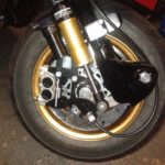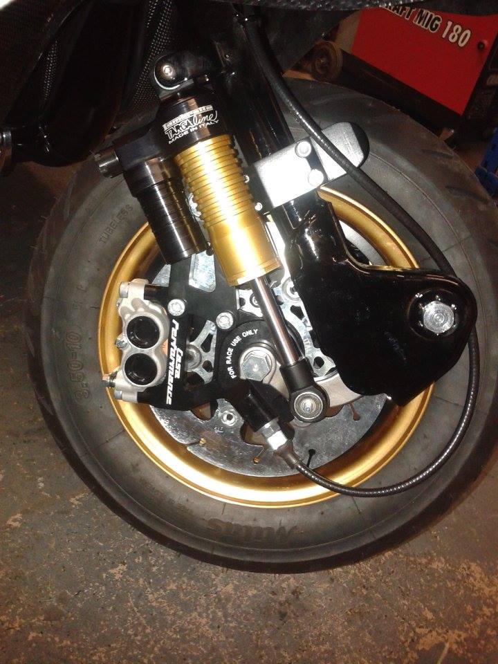 The front forks were checked for any bends or damage and then they were rebuilt with all new components including a massive 210mm Casa disc and fully adjustable dampers. The rest of the scooter has been built using light weight components, alloy and titanium bolts where possible.