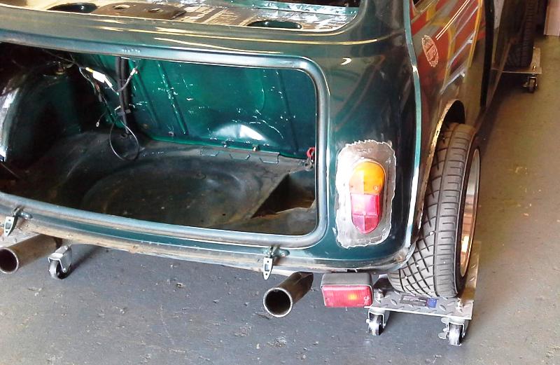 The first thing was to strip the car and then modify some of the panel work. The rear arches were tubbed to allow for a low ride height, the rear seat squab and pockets were also removed as the car will be a 2 seater, MK1 rear light panels were fitted and then the boot floor and rear valance were modified to allow for a custom exhaust system.