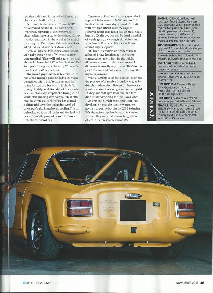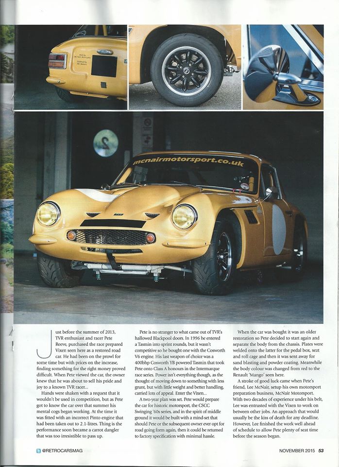 McNair Motorsport were privileged to be contacted by Retro Cars Magaine who were interested in carrying out a full feature on the TVR Vixen that we built. After seeing the car in the flesh a photo shoot was arranged where the photographer took over 100 pictures of the yellow car.